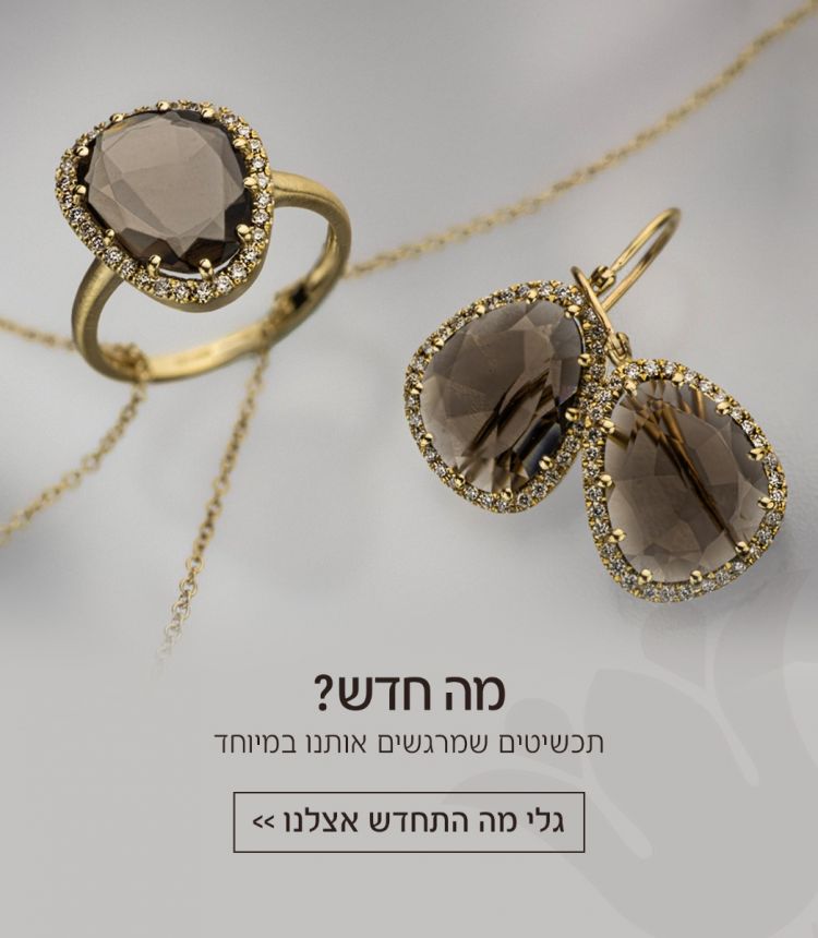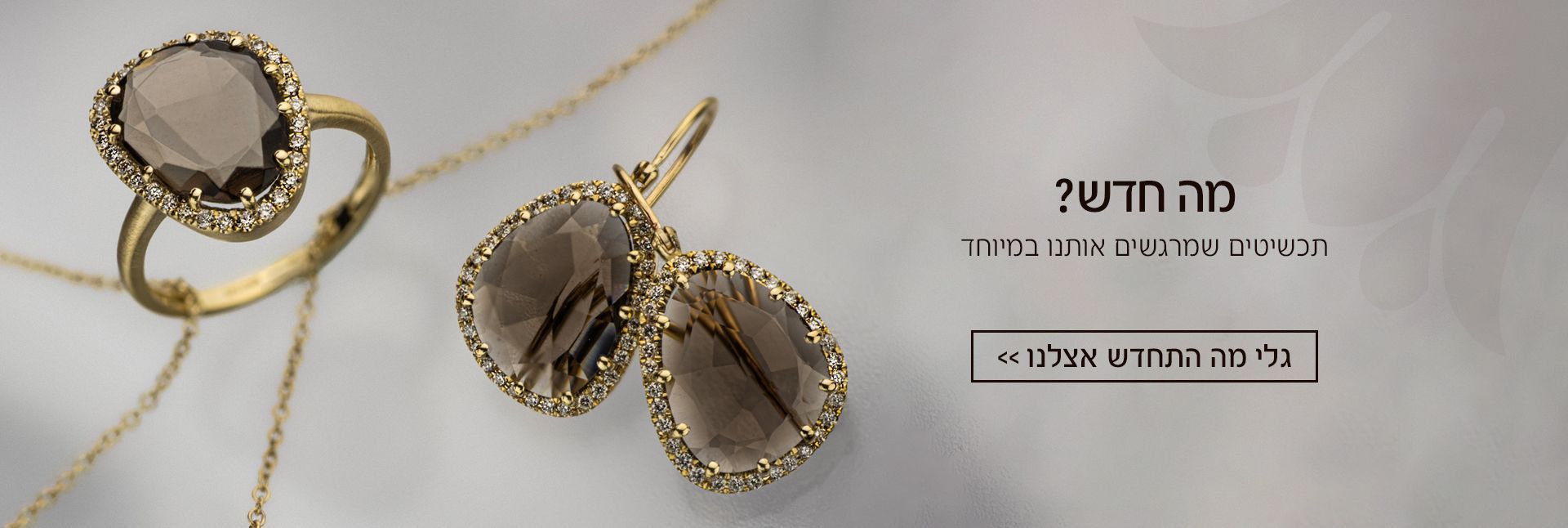 תכשיטי זהב 14 קראט בשיבוץ אבני סמוקי קוורץ ויהלומים